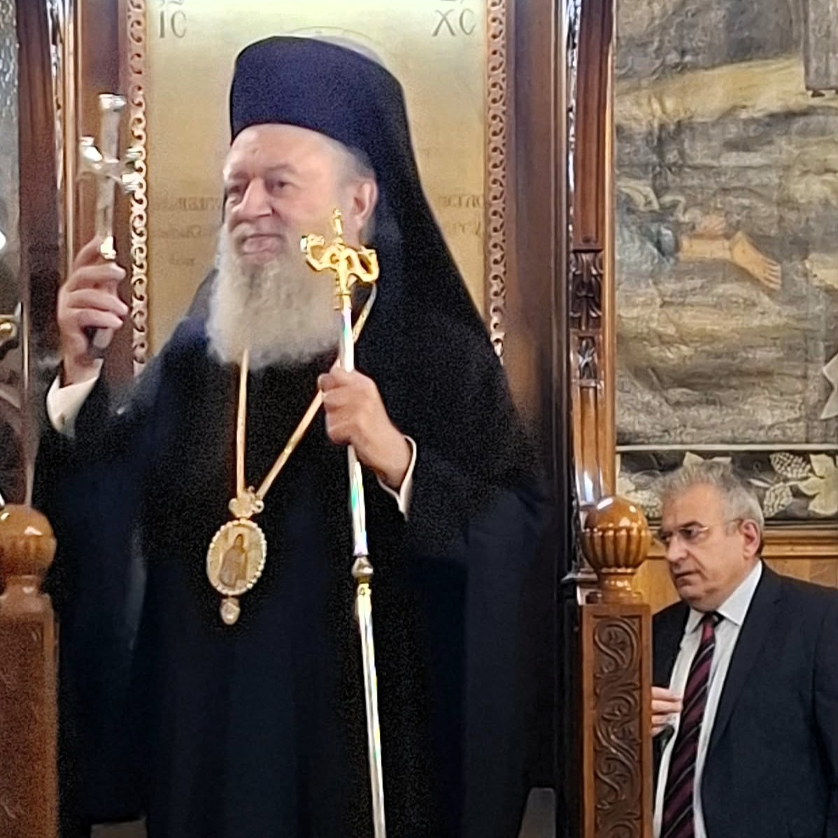 Λίγο πριν το «Δι’ ευχών», ο Θεοφιλέστατος κ. Νικόδημος ευχήθηκε εορτίως στον συλλειτουργό Αρχιδιάκονο του Μητροπολιτικού Ναού των Αθηνών Ιωάννη Καρπασινό, ο οποίος επέλεξε να έρθει να εορτάσει μαζί μας τα ονομαστήριά του ως αδελφός. Τον ευχαρίστησε για την παρουσία του και του ευχήθηκε να τον αξιώνει ο Θεός κρειττόνων χαρισμάτων. Επίσης, αφού εδήλωσε τη χαρά του, για την πολυπληθή συμμετοχή των εκκλησιασθέντων και ευχήθηκε σε όλους εορτίως, εξέφρασε λόγους τιμής, επαίνου και ευχαριστίας προς μεν τον επί πεντηκονταετία πρωτοψάλτη της Ενορίας κ. Ιωάννη Κουρούπη και προς τον προσφάτως λαβόντα Πτυχίο Βυζαντινής Μουσικής, από τη Σχολή της Ι. Μητροπόλεως, λαμπαδάριο κ. Γεώργιο Αλεξίου.