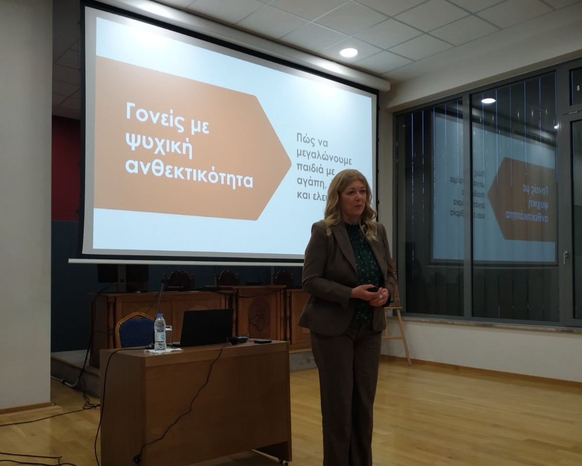 Ομιλήτρια ήταν η εξειδικευμένη στις ΕΜΔ (Ειδικές Μαθησιακές Δυσκολίες) εκπαιδευτικός και σύμβουλος προσωπικής ανάπτυξης κυρία Γιούλη Σκλιά-Λάμπρου, η οποία ανέπτυξε, με ιδιαιτέρως ενδιαφέρουσες προεκτάσεις, το θέμα: «Γονείς με ψυχική ανθεκτικότητα. Πώς να μεγαλώνουμε παιδιά με αγάπη, όρια και ελευθερία;».