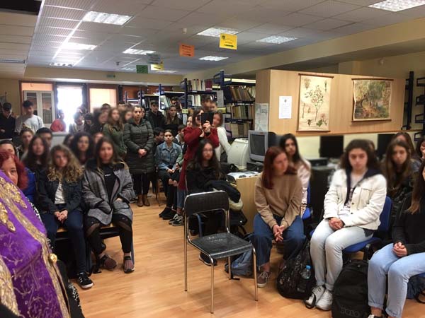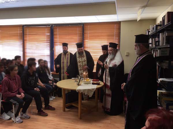 Εν συνεχεία, φτάνοντας ο Σεβασμιώτατος στο 1ο Λύκειο, συνοδευόμενος από τους Διακ. Νικόλαο Πριμηκύριο και Ευγένιο Τσάλλα, τον υποδέχθηκαν οι Ιερείς της Ενορίας Αγ. Νικολάου, Αρχιμ. Χρυσόστομος Καλύβας, Πρωτ. Ηλίας Αγιαννίτης, Πρωτ. Χαράλαμπος Ταραμίγκος, η Λυκειάρχης κ. Μαρίας Ματθαίου με τον περί αυτήν σύλλογο των καθηγητών και τους μαθητές.