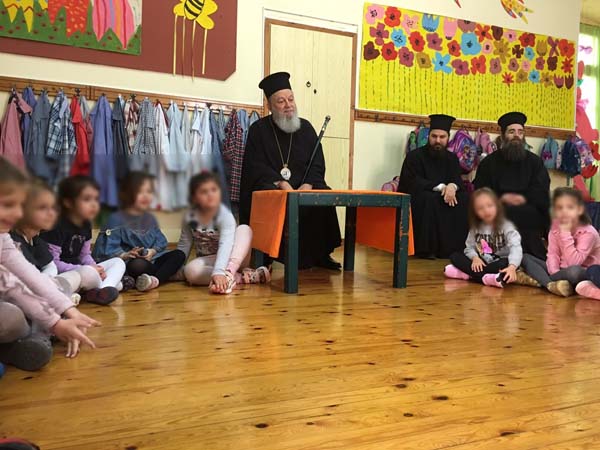 Τα ενθουσιασμένα μικρά παιδιά τραγούδησαν στον Ποιμενάρχη τους κάλαντα της περιόδου της Μεγάλης Εβδομάδας και εκείνος τους μίλησε εποικοδομητικά για την Ανάσταση του Λαζάρου και τον Προστάτη της Ενορίας, που το Νηπιαγωγείο ανήκει, τον Αγ. Δημήτριο. Κλείνοντας, τους ευχήθηκε να εορτάσουν με χαρά την Ανάσταση του Χριστού, μοιράζοντας σε όλους αναμνηστικές ευλογίες.