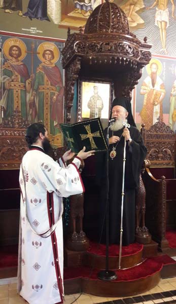 Εκεί, χοροστάτησε κατά την Ακολουθία του Όρθρου και προεξήρχε στην τελεσθείσα Θεία Λειτουργία, η οποία μεταδοθηκε σε απευθείας σύνδεση από τον Ραδιοφωνικό Σταθμό της Ι. Μητροπόλεως Χαλκίδος στους 97,7 μεγακύκλους, έχοντας ως συλλειτουργούς του, πλην των συνοδών του Κληρικών, και τους Εφημερίους της Ενορίας Πρωτοπρεσβ. Νικόλαο Σακαγιάννη και Οικον. Ιωάννη Σούρα.