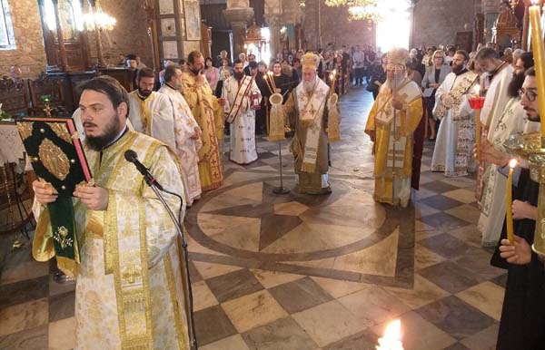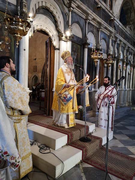 Τα ιερά αναλόγια διηκόνησαν οι Ιεροψάλτες του Ι. Ναού, Κωνσταντίνος Σιάνος και Νικόλαος Βαβίλης με τις χορωδίες τους και το σύνολο των ιερών ακολουθιών μεταδόθηκε ζωντανά από τον Ραδιοφωνικό Σταθμό της Ιεράς Μητροπόλεως (97,7 fm).
