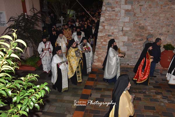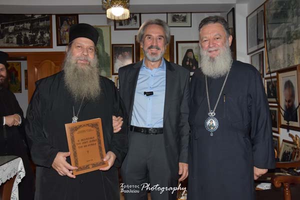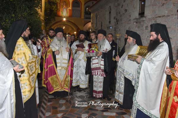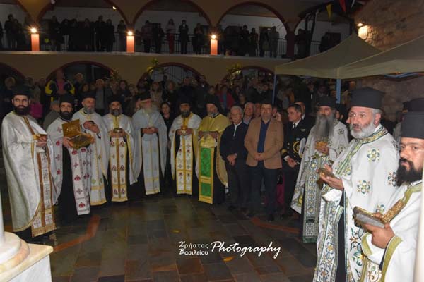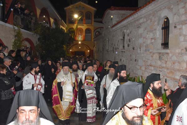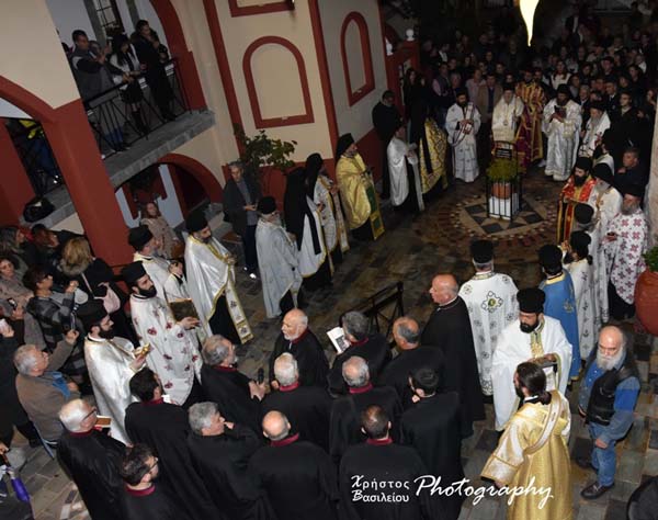 Λίγο πριν την Απόλυση του Εσπερινού, ο Σεβασμιώτατος κ. Χρυσόστομος εξέφρασε την χαρά του για την παρουσία του Σεβασμιωτάτου κ. Δαμασκηνού στο Μοναστήρι και την συγκίνηση του για την πολυπληθέστατη παρουσία των πιστών προσκυνητών, ενώ συνεχάρη τον άγιο Καθηγούμενο π. Γαβριήλ και τους αδελφούς της Μονής, την χορωδία των αγίων ιεροψαλτών “Βυζαντινοί Υμνωδοί”, υπό την διεύθυνση του Καθηγητού Βυζαντινής Μουσικής κ. Σπυρίδωνος Παυλάκη, καθώς και όλους τους διακονήσαντες την Ιερά Μονή για την αγαθή έκβαση της πανηγύρεως και ευχήθηκε σε όλους εόρτια, ιδιαιτέρως στον εορτάζοντα αδελφό της Ιεράς Μονής, Αρχιμ. Δαυΐδ Ψαράκη.