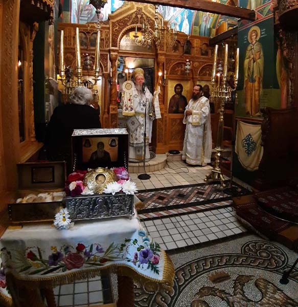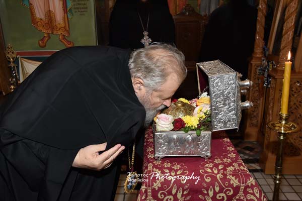 Κατά την κυριώνυμη ημέρα της πανηγύρεως, Παπασκευή 1 Νοεμβρίου 2019, χοροστάτησε στον Όρθρο και προεξήρχε στη Θεία Λειτουργία ο Σεβασμιώτατος Μητροπολίτης Κυδωνίας και Αποκορώνου κ. Δαμασκηνός, με την συλλειτουργία και του Σεβασμιωτάτου Ποιμενάρχου μας, Μητροπολίτου Χαλκίδος κ. Χρυσοστόμου και πολλών ακόμη Ιερέων, με πρώτο τον Πρωτοσύγκελλο της Ι. Μητροπόλεως Κυδωνίας, Αρχιμ. Δαμασκηνό Λιονάκη.