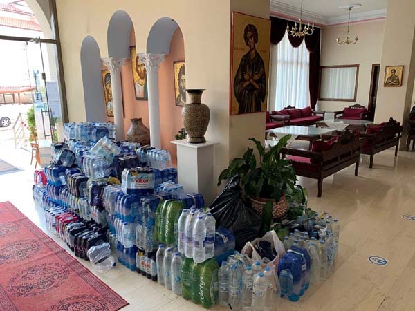 Επίσης ο Ξενώνας του Ιερού Προσκυνήματος παραμένει ανοικτός και φιλοξενεί πυροπλήκτους αδελφούς μας που αναγκάστηκαν να εγκαταλείψουν τα σπίτια τους, ενώ φιλοξενεί και κλιμάκιο του Ερυθρού Σταυρού, ώστε να παρέχονται οι πρώτες βοήθειες σε τυχόν τραυματίες. Στον ισόγειο χώρο του Ξενώνα, επίσης συγκεντρώνονται είδη πρώτης ανάγκης προς ανακούφιση των εμπερίστατων αδελφών μας και των μαχητών-πυροσβεστών.