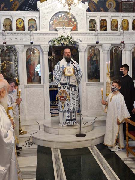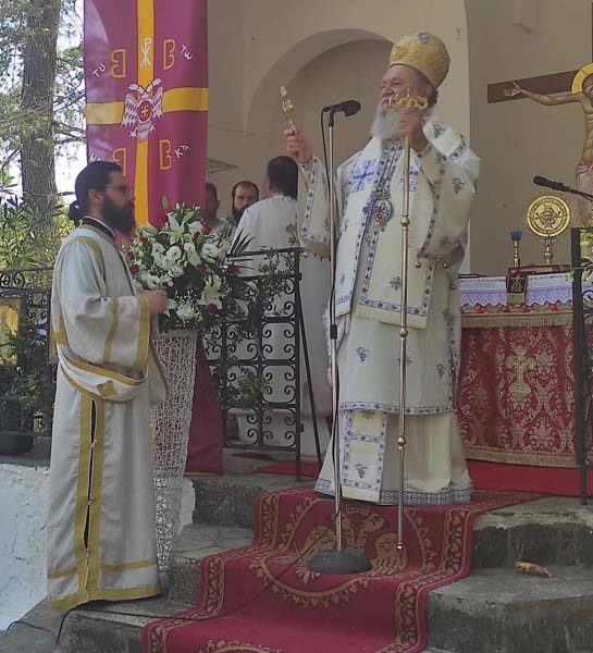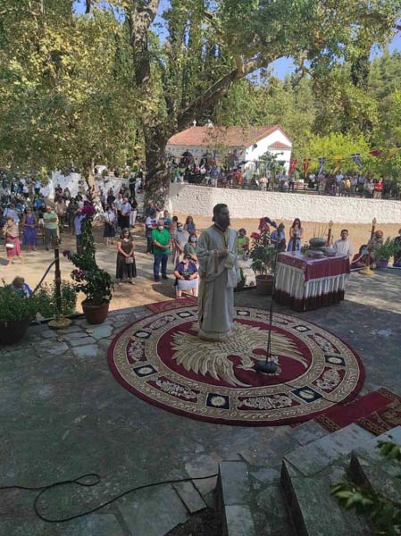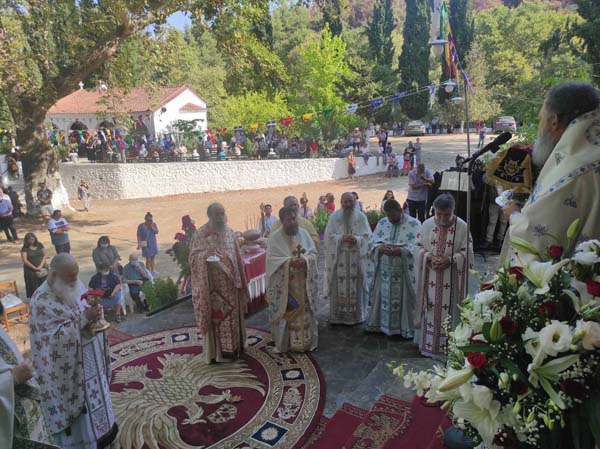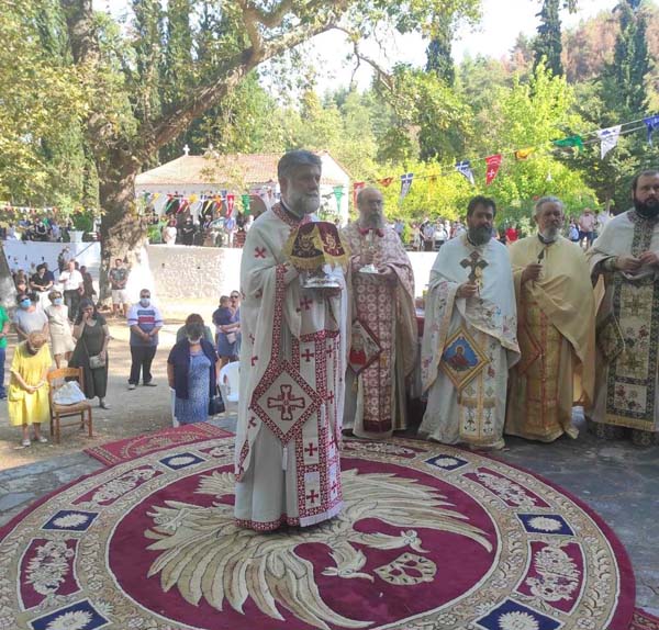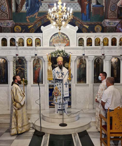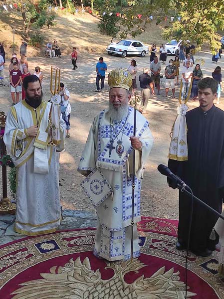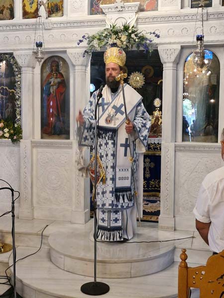 Ο Σεβασμιώτατος κήρυξε προς τους συρρέοντες εκεί πιστούς πανηγυρικό λόγο, αναφερόμενος στην Κοίμηση εις ουρανούς Μετάσταση της Παναγίας, ως γεγονότα χαροποιά για όλους εμάς, διότι, όπως η Υπεραγία Θεοτόκος έλαβε στον Ευαγγελισμό της την πληροφορία ότι ο Κύριος είναι μετ’ Αυτής, με την Κοίμησή Της χαρίζεται η πληροφορία σε όλο τον κόσμο ότι ο Θεός, διά της Θεοτόκου, είναι και μεθ’ ημών. Μα η χαρά είναι προϊόν αμοιβαίας αντίδοσης. Έτσι, για να μένει συνεχώς η Παναγία πηγή χαράς για εμάς, οφείλουμε κι εμείς να Της προσφέρουμε χαρά τηρώντας τις εντολές του Θεανθρώπου Υιού Της και Σωτήρα μας.