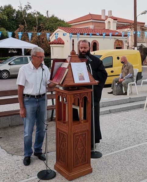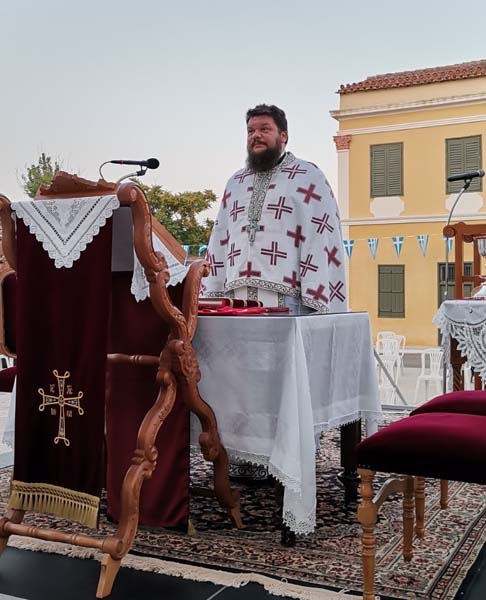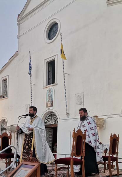 Εκεί το εσπέρας έλαβε χώρα ο Μέγας Εσπερινός επί τη μνήμη του Αγίου, προεξάρχοντος του Αρχιμ. Θεοφυλάκτου Τσαγκάρη-Προϊσταμένου του Ενοριακού Ι. Ν. Ευαγγελιστρίας Κανήθου Χαλκίδος και υπευθύνου του Ιδιαιτέρου Γραφείου του Σεβασμιωτάτου Μητροπολίτου μας. Ο π. Θεοφύλακτος κήρυξε και τον θείο λόγο, ενώ προ της απολύσεως του Εσπερινού ανέγνωσε και την ευχή ευλογίας των πιττών, που προσεκόμισαν ευσεβείς προσκυνητές και προσκυνήτριες προς τιμήν του Αγίου Φανουρίου.
