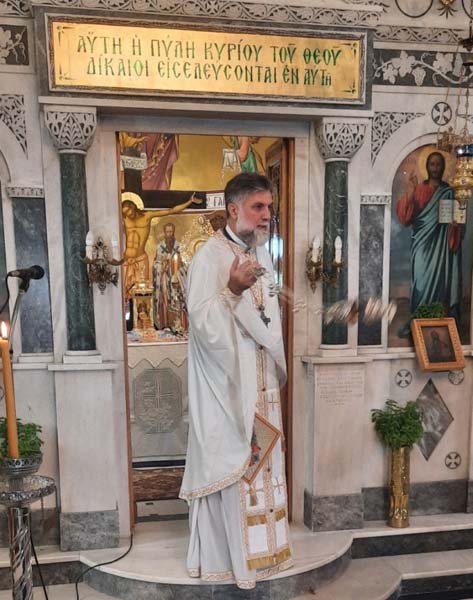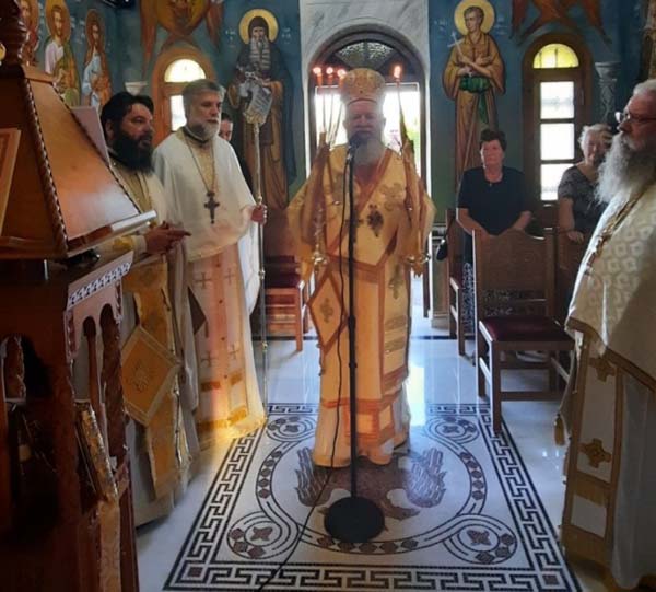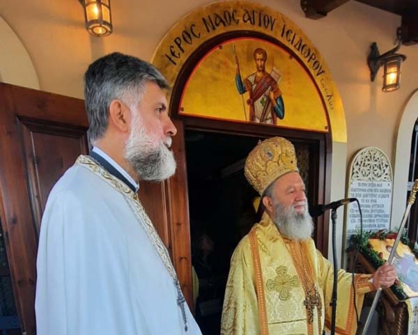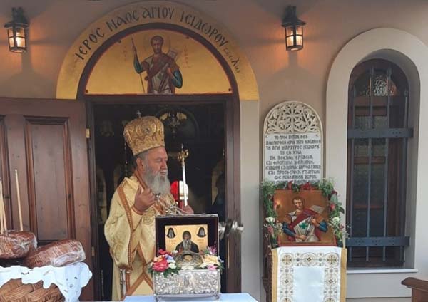 Συγκεκριμένα, το Σάββατο ο Σεβασμιώτατος χοροστάτησε στον Όρθρο, προέστη στην Θεία Λειτουργία και κήρυξε τον θείο λόγο, στο Ενοριακό Ι. Παρεκκλήσιο του Αγίου Ισιδώρου του εν Χίω μαρτυρήσαντος, το οποίο βρίσκεται στον καμένο πλέον ελαιώνα του χωριού.
