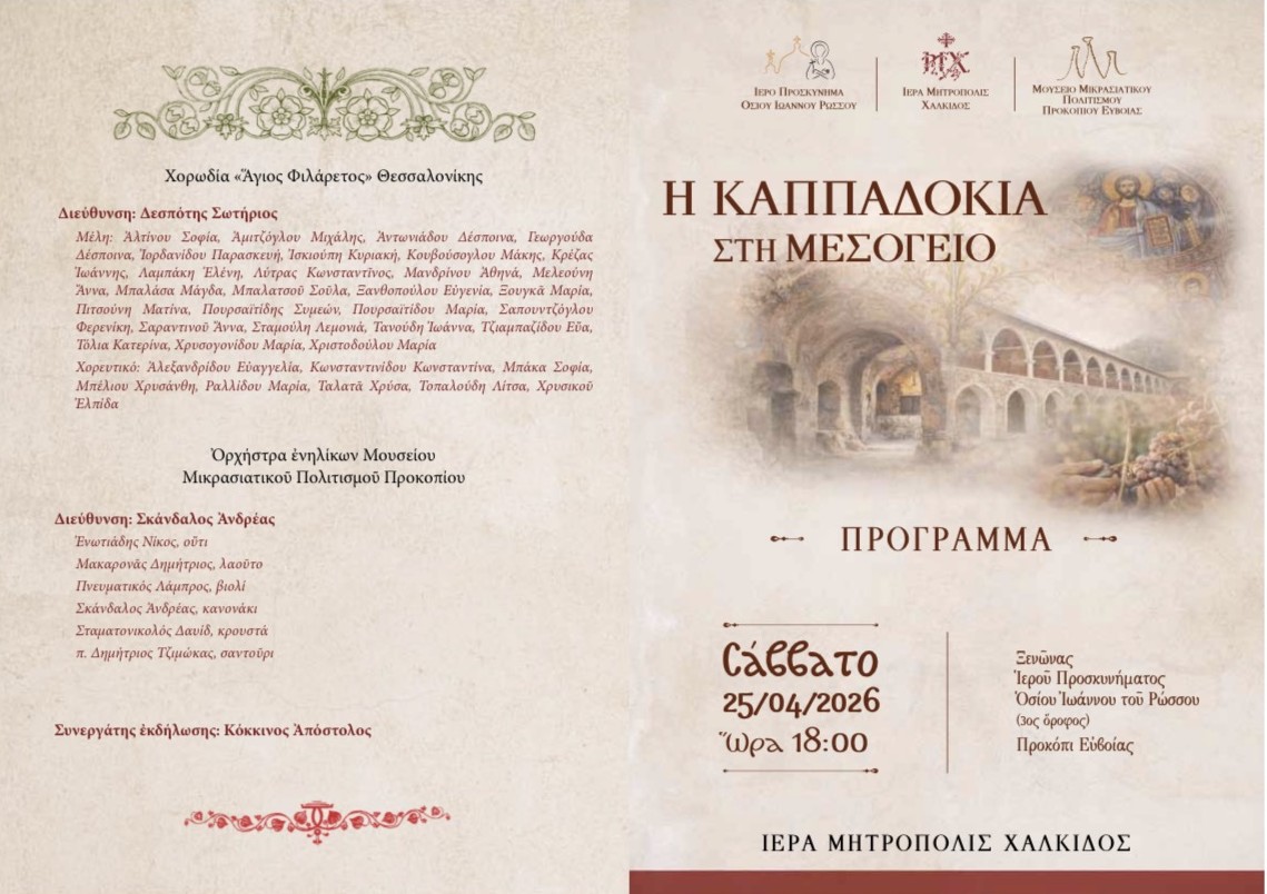 Η Ιερά Μητρόπολις Χαλκίδος ανακοινώνει τη διοργάνωση πολιτιστικής εκδηλώσεως με τίτλο «Η ΚΑΠΠΑΔΟΚΙΑ ΣΤΗ ΜΕΣΟΓΕΙΟ», η οποία θα πραγματοποιηθεί το Σάββατο 25 Απριλίου 2026, στις 6 μ.μ., στην αίθουσα εκδηλώσεων (3ος όροφος) του Ξενώνα του Ι. Προσκυνήματος του Οσίου Ιωάννου του Ρώσσου.