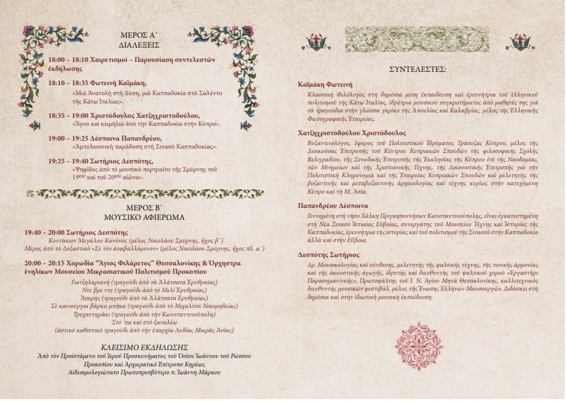 7:25μ.μ.: «Ψηφίδες από το μουσικό πορτραίτο της Σμύρνης του 19ου και του 20ού αιώνα», από τον κ. Σωτήριο Δεσπότη-Δρα Μουσικολογίας, συνθέτη και ιεροψάλτη.