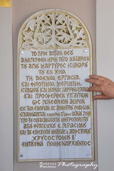 Τελέστηκαν την Τρίτη 5 Ιουνίου 2018 τα εγκαίνια του Ιερού Ναού Αγίου Ισιδώρου του Χίου, παρεκκλησίου της Ενορίας Αγίου Δημητρίου Ροβιών Ευβοίας, της Ιεράς Μητροπόλεως Χαλκίδος.