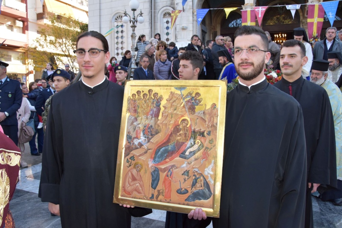 Μετά το πέρας των Ιερών Ακολουθιών ξεκίνησε η ιερά Λιτανεία, υπό τους ήχους της Φιλαρμονικής Ορχήστρας του Δήμου Χαλκιδεών με Αρχιμουσικό τον κ. Πέτρο Πρόκο και με την συμμετοχή του Ιερού Κλήρου, των Αρχών και πλήθους πιστού Λαού του Θεού, κατευθύνθηκε στην Παραλία, στο χώρο μπροστά από το Δημαρχείο Χαλκίδος.