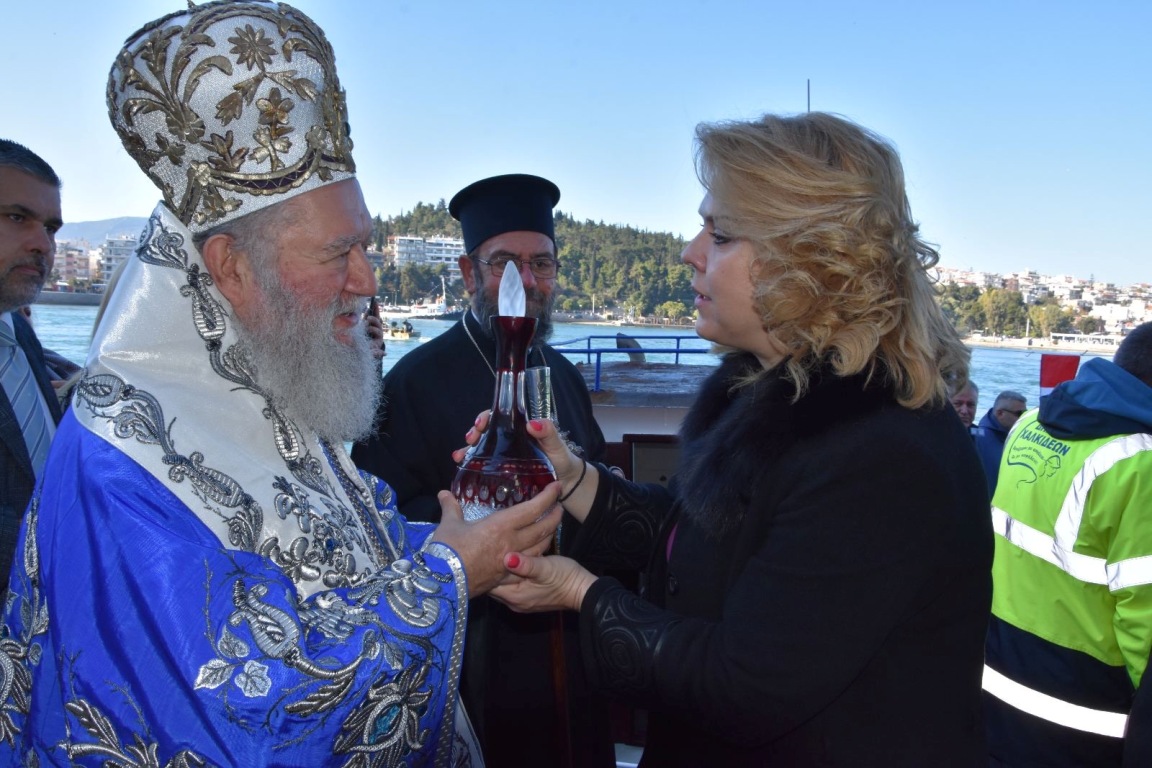 Μετά την έξοδο όλων από το πλωτό σκάφος, ο Σεβασμιώτατος παρέδωσε στη Δήμαρχο κ. Έλενα Βάκα δοχείο του Αγιασμού για το Υδραγωγείο της Πόλεως και στη συνέχεια η Λιτανευτική Πομπή επέστρεψε στον Ιερό Ναό του Αγίου Νικολάου, όπου και έγινε η Απόλυση. Κατά την διάρκεια της Λιτανείας, παρατηρήθηκε το φαινόμενο, που έχει γίνει παράδοση πλέον στον Τόπο μας, πολλά παιδάκια, αλλά και μεγαλύτεροι να τρέχουν προς τον Σεβασμιώτατο για να ασπαστούν τον Τίμιο Σταυρό.