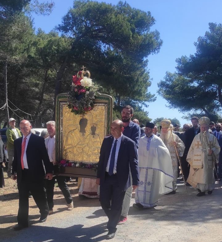 Το Σάββατο το πρωί, ο Σεβασμιώτατος, αφού αφίχθηκε στο νησί, μετέβη για προσκύνημα στις Ι. Μονές Αγίας Μόνης και Μυρτιδίων, που φυλάσσεται η έφορος του νησιού Παναγία Μυρτιδιώτισσα.